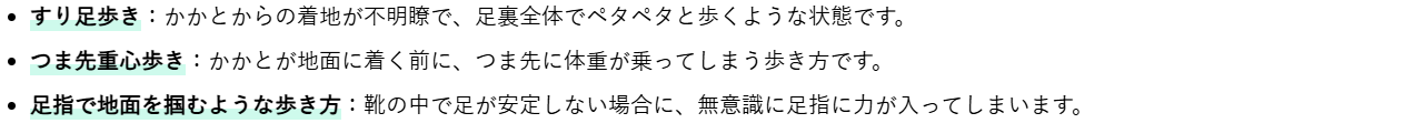 まず、ご自身の歩き方を確認してみましょう。以下のような歩き方は、足に負担をかけている可能性があります。