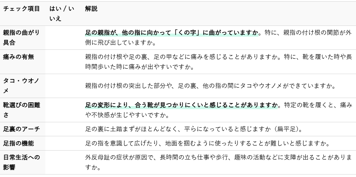 チェック項目に「はい」が多いほど、外反母趾の症状が進行している可能性があります。ご自身の足の状態を理解し、早めのケアを始めることが大切です。