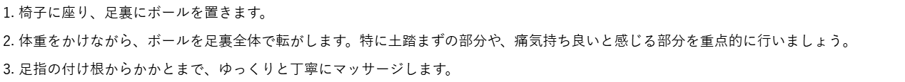 ゴルフボールやテニスボールを使って足裏を刺激することで、硬くなった筋肉をほぐし、血行を促進します。