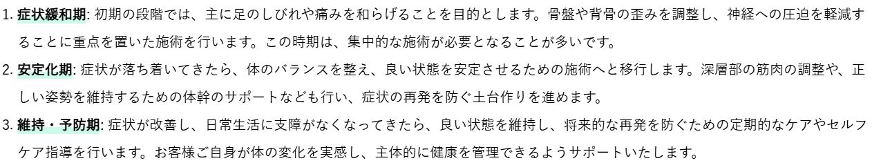 整体での椎間板ヘルニアによる足のしびれ改善は、お客様の状態に合わせた段階的なアプローチで進められます。