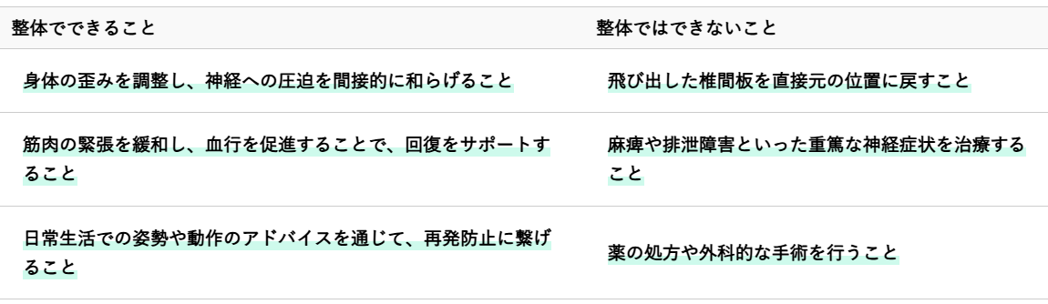 一方で、整体ではできないことも明確にしておく必要があります。整体は飛び出した椎間板そのものを直接元の位置に戻すことはできません。また、麻痺や排泄障害といった重篤な神経症状が進行している場合や、炎症が非常に強い急性期には、専門的な医療処置が必要となることがあります。整体は薬の処方や外科的な手術を行うこともできません。