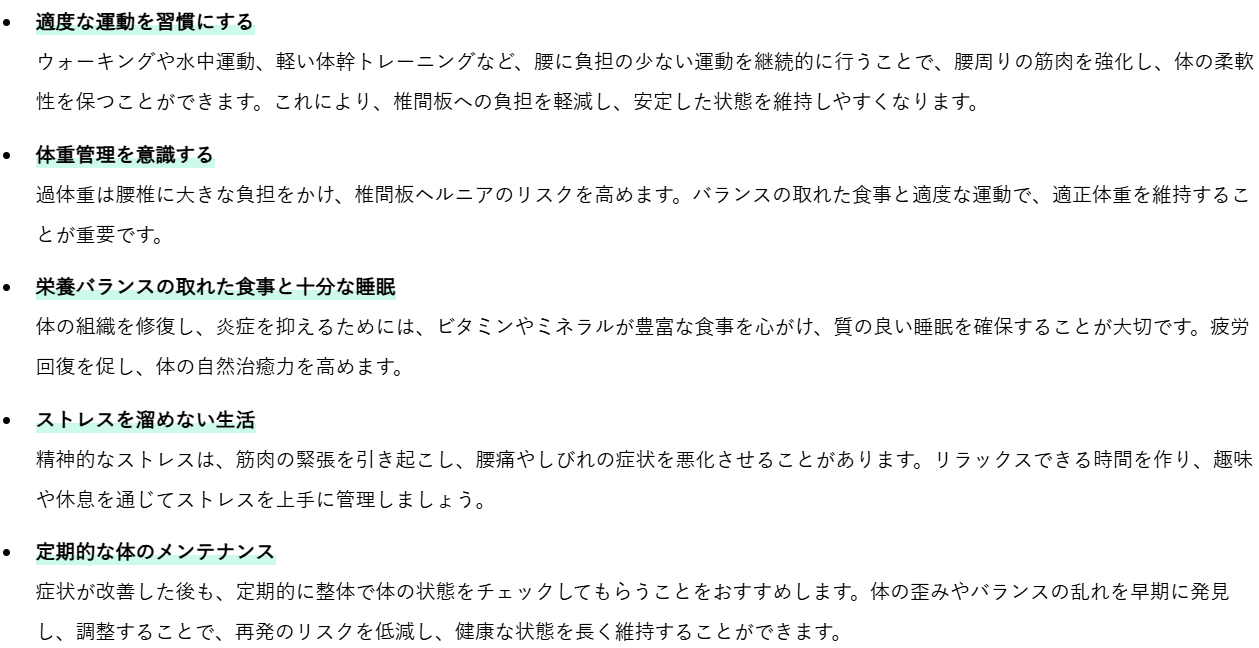 これらの予防策を日常生活に取り入れることで、椎間板ヘルニアによる足のしびれの再発を防ぎ、より快適な生活を送ることができるでしょう。