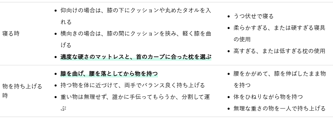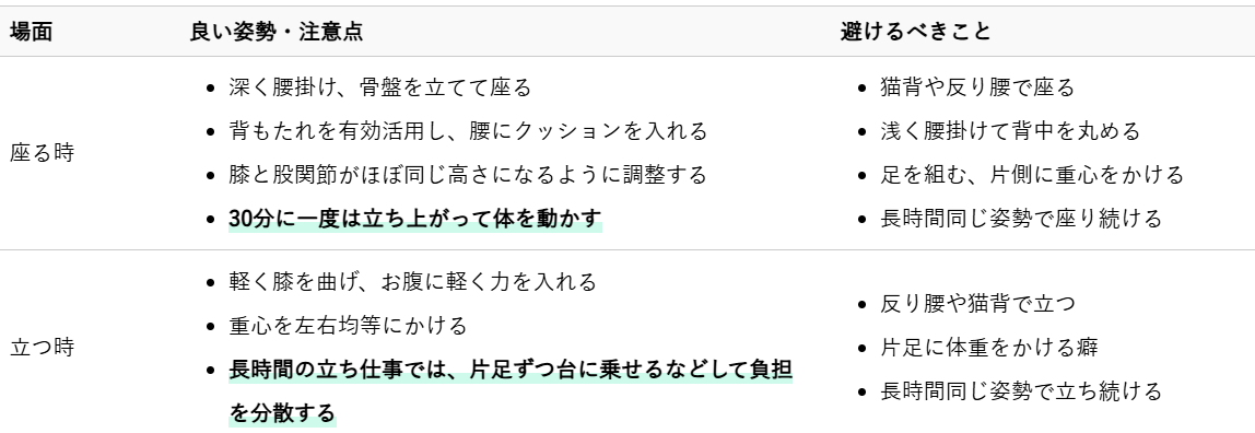 日常生活においては、正しい姿勢を意識し、長時間同じ体勢を避けるように心がけてください。特に座り方や立ち方、重いものを持つ際の体の使い方には注意が必要です。体の使い方一つで、椎間板への負担は大きく変わります