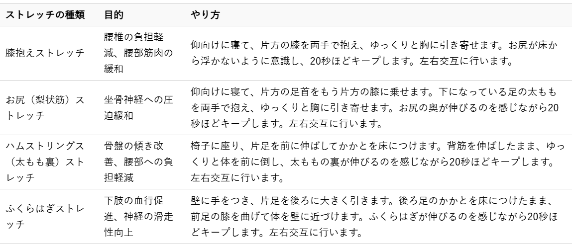 足のしびれを和らげ、腰部への負担を軽減するためには、筋肉の柔軟性を高めるストレッチが効果的です。ただし、無理のない範囲で行い、痛みを伴う場合はすぐに中止してください。症状が悪化する可能性もありますので、不安な場合は整体師にご相談ください。