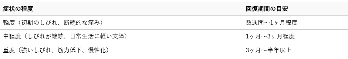 以下に、症状の程度による回復期間の目安を示しますが、これはあくまで一般的な傾向であり、個人差があることをご理解ください。