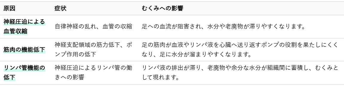 神経は、筋肉の動きをコントロールするだけでなく、血管やリンパ管の働きにも深く関わっています。神経が圧迫されると、これらの機能が正常に働かなくなり、足のむくみにつながることが考えられます。