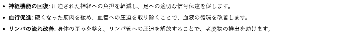 また、筋肉の緊張が和らぐことで、神経への負担も軽減され、自律神経のバランスが整いやすくなるという効果も期待できます。自律神経は、血管の収縮・拡張をコントロールしているため、そのバランスが整うことは、全身の血行改善に大きく寄与し、結果として足のむくみの改善にも繋がるのです。