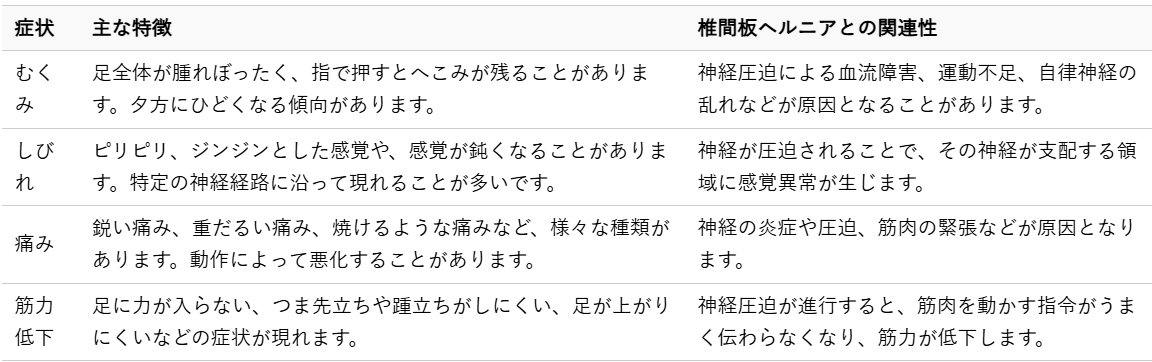 椎間板ヘルニアが原因で足に現れる症状は、むくみだけではありません。痛み、しびれ、筋力低下など、さまざまな症状が複合的に現れることがあります。これらの症状の中には、むくみと似ているように感じられるものもあり、ご自身で正確に判断することが難しい場合があります。