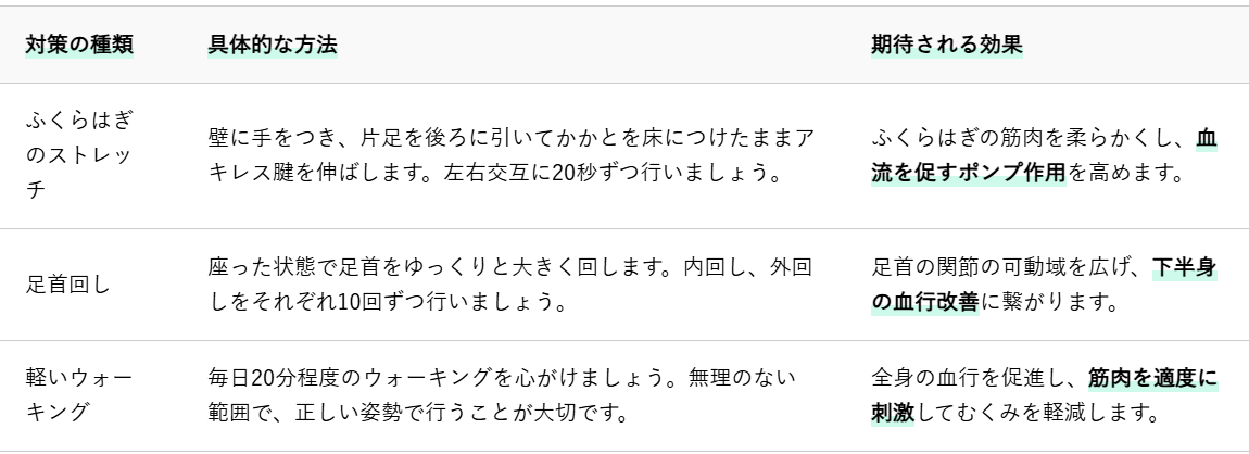 足のむくみ改善には、血行を促進し、筋肉のポンプ作用を高めることが重要です。特にふくらはぎや足首の柔軟性を高めるストレッチや、全身の血流を促す軽い運動が効果的です。