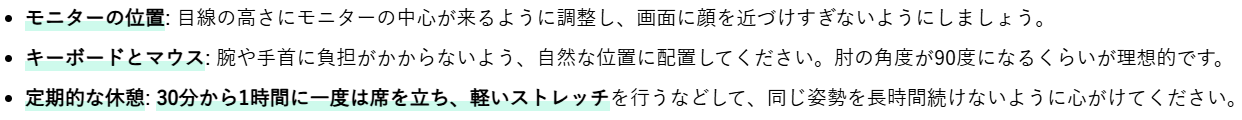 パソコン作業が多いデスクワークでは、モニターやキーボード、マウスの位置が姿勢に大きく影響します。以下の点に注意してください。