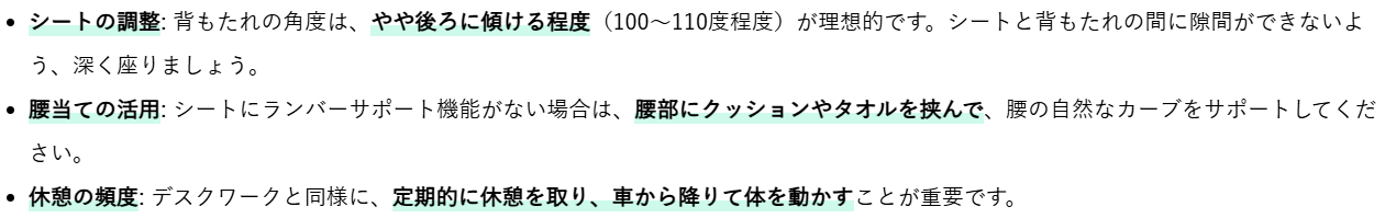 車の運転中も、正しい座り方を意識することが大切です。特に長距離運転では、腰への負担が大きくなります。