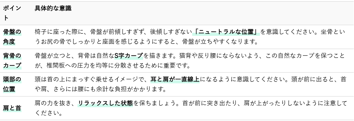 椎間板ヘルニアの痛みを和らげるためには、日頃の座り方を改善することが非常に大切です。ここでは、整体師の視点から、椎間板への負担を最小限に抑え、快適に過ごすための正しい座り方のポイントを詳しく解説いたします。