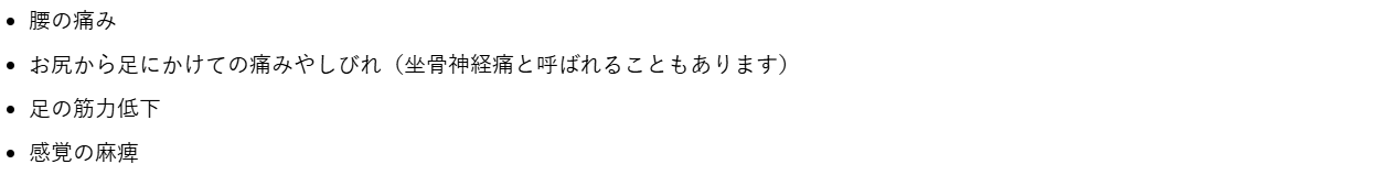 多くの場合、腰の椎間板に発生し、主な症状としては以下のようなものが挙げられます。